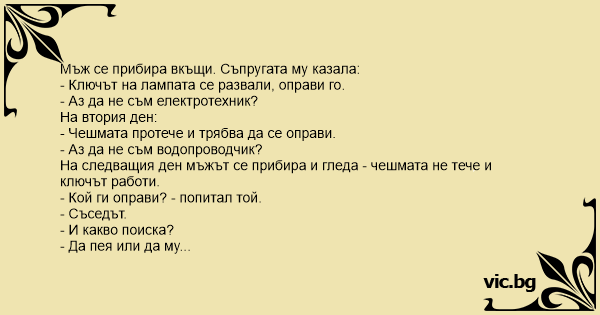След като Иванчо и Марийка се оженили, вкъщи всичко започнало едно след друго да се разваля. A newlywed couple moves into their new house. One day the husband comes home from work and his wife says: Une femme demande à son mari : - Chéri, le robinet est cassé, peux-tu le réparer stp ? - Je ne suis pas plombier ! - Chéri, il n'y a plus de lumière dans la salle de bain, tu t'en occupes stp ? - Je ne suis pas électricien ! Quelques heures après, la femme dit à son mari : - Chéri, le... Komt een man 's avonds laat thuis van zijn werk begint zijn vrouw gelijk te zeuren: "Schat, de deur klemt. "Zegt de man: "Ik ben toch zeker geen timmerman ? " "De gootsteen in de keuken is ook... Kvinnan till sin man: - Kranen droppar, kan du laga den? - Jag är väl ingen rörmokare heller! Lite senare: - Lamporna fungerar inte kan du laga dom? - Jag är väl ingen elektriker heller! När mannen... Jeg er ikke elektriker En kone ser at der er sprunget en pære i lampen og beder manden skifte den. "Nej!" siger manden, "jeg er ikke elektriker. " Dagen efter er det galt med vandhanen, og konen...