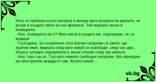 - Ало, пак съм аз. Тъй като нямате свободни патрулки, бях принуден да прострелям крадците сам. Когато някой се освободи, пратете с него две-три линейки да приберат труповете.
