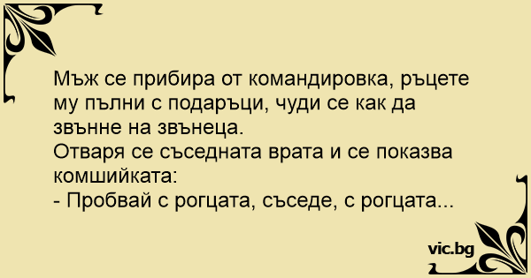 Мъж се прибира от командировка, ръцете му пълни с подаръци, чуди се как да звънне на звънеца.