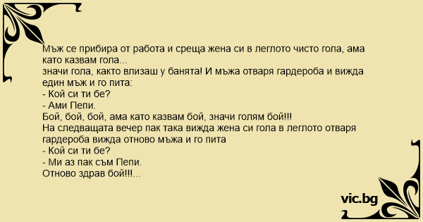 Мъж се прибира от работа и среща жена си в леглото чисто гола, ама като казвам гола...