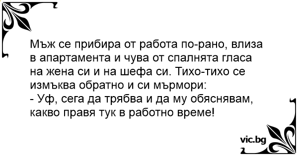 Мъж се прибира от работа по-рано, влиза в апартамента и чува от спалнята гласа на жена си и на шефа си. Тихо-тихо се измъква обратно и си мърмори: