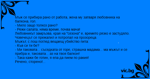 Мъж се прибира рано от работа, жена му затваря любовника на балкона, гол.