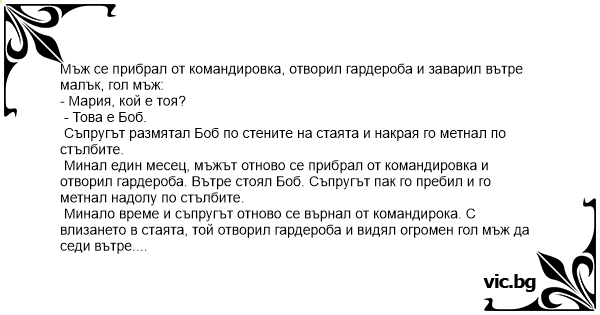 Минал един месец, мъжът отново се прибрал от командировка и отворил гардероба. Вътре стоял Боб. Съпругът пак го пребил и го метнал надолу по стълбите.