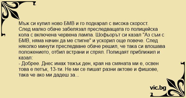 След малко обаче забелязал преследващата го полицейска кола с включена червена лампа. Шофьорът си казал "Аз съм с БМВ, няма начин да ме стигне" и ускорил още повече. След няколко минути преследване обаче решил, че така си влошава положението, отбил встрани и спрял. Полицаят приближил и казал: