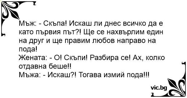 Мъж: - Скъпа! Искаш ли днес всичко да е като първия път?! Ще се нахвърлим един на друг и ще правим любов направо на пода!