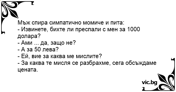 Egy férfi megszólít egy nőt az utcán: - Mondja, hölgyem, lefeküdne velem egymillió dollárért? - Egymillió dollárért? Le. - És 50 dollárért? - Na de uram, mit gondol, mi vagyok én? - Hogy Ön...