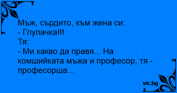 Мъж, сърдито, към жена си: - Глупачка!!! Тя: - Ми какво да правя... На комшийката мъжа и професор, тя - професорша...