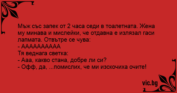 Мъж със запек от 2 часа седи в тоалетната. Жена му минава и мислейки, че отдавна е излязал гаси лапмата. Отвътре се чува: