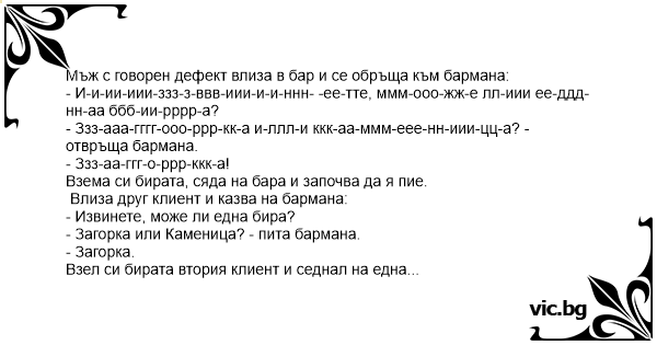 В този момент, първия клиент с говорния дефект побеснял и отива да търси саморазправа с бармана: