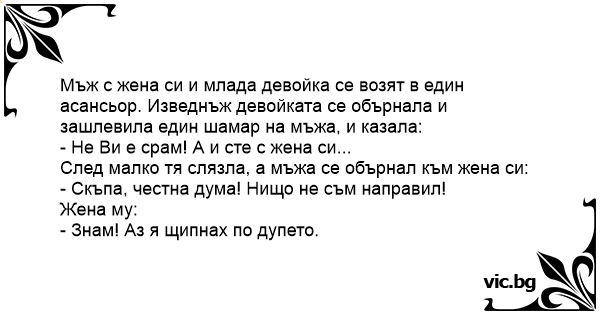 Мъж с жена си и млада девойка се возят в един асансьор. Изведнъж девойката се обърнала и зашлевила един шамар на мъжа, и казала: