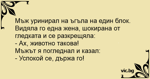 Пиян пикае на една ограда. Жена, минаваща наблизо се възмущава. - Ужас, какъв звяр, какво животно! - Спокойно бе госпожо. Не се плашете, държа го за врата ....