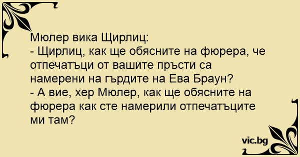 - Щирлиц, как ще обясните на фюрера, че отпечатъци от вашите пръсти са намерени на гърдите на Ева Браун?