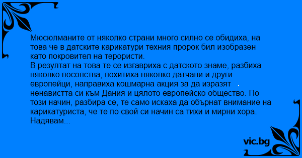 Мюсюлманите от няколко страни много силно се обидиха, на това че в датските карикатури техния пророк бил изобразен като покровител на терористи.