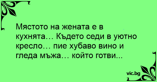 Мястото на жената е в кухнята… Където седи в уютно кресло… пие хубаво вино и гледа мъжа… който готви...