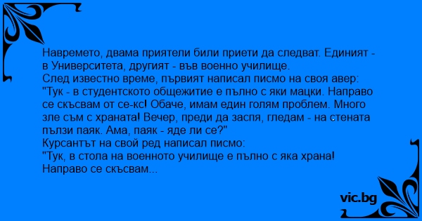 Навремето, двама приятели били приети да следват. Единият - в Университета, другият - във военно училище.