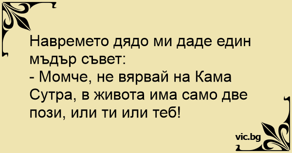 - Момче, не вярвай на Кама Сутра, в живота има само две пози, или ти или теб!