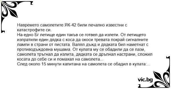 На едно Бг летище един такъв се готвел да излети. От летището изпратили един дядка с коса да окоси тревата покрай сигналните лампи в страни от пистата. Валял дъжд и дядката бил наметнат с противодъждовна мушама. От кулата му се обадили да се пази, самолета тръгнал да излита, дядката се дръпнал настрани, сложил косата до себе си и помахал на самолета...
