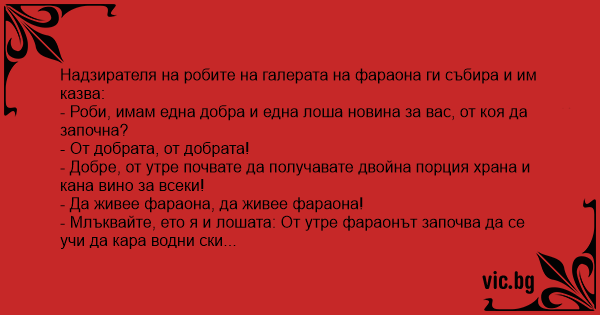 On a Roman warship, the galley boss looked over his slaves and shouted, "Today I have good news. All of you are getting extra food tonight."