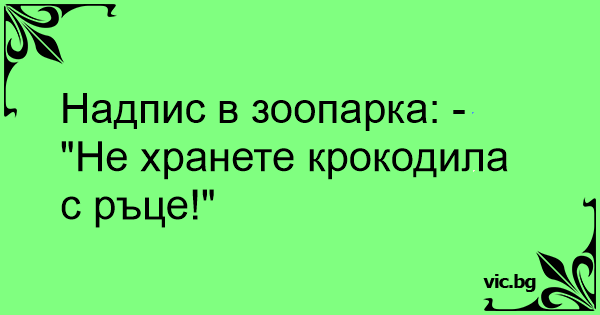 Надпис в зоопарка: - "Не хранете крокодила с ръце!"
