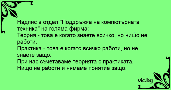 Tabliczka w dziale komputerowego wsparcia: Teoria - to kiedy wiecie wszystko, lecz nic nie pracuje. Praktyka - to kiedy wszystko pracuje, lecz nikt nie wie dlaczego. W tym miejscu łączymy teorię i...