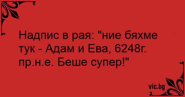 Надпис в рая: "ние бяхме тук - Адам и Ева, 6248г. пр.н.е. Беше супер!"