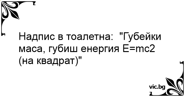 Надпис в тоалетна: "Губейки маса, губиш енергия E=mc2 (на квадрат)"
