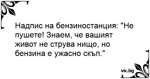 Надпис на бензиностанция: "Не пушете! Знаем, че вашият живот не струва нищо, но бензина е ужасно скъп."