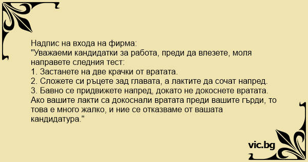 "Уважаеми кандидатки за работа, преди да влезете, моля направете следния тест: