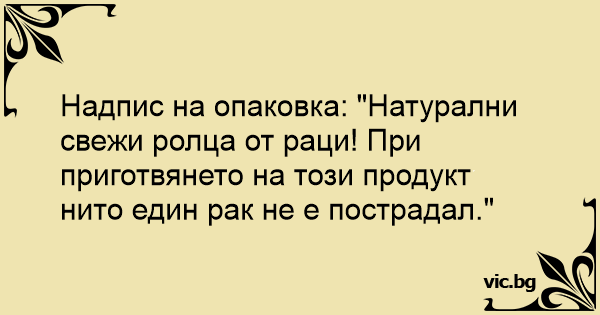 Надпис на опаковка: "Натурални свежи ролца от раци! При приготвянето на този продукт нито един рак не е пострадал."