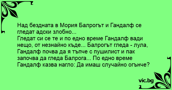 Гледат си се те и по едно време Гандалф вади нещо, от незнайно къде... Балрогът гледа - лула, Гандалф почва да я тъпче с пушилист и пак започва да гледа Балрога... По едно време Гандалф казва нагло: Да имаш случайно огънче?