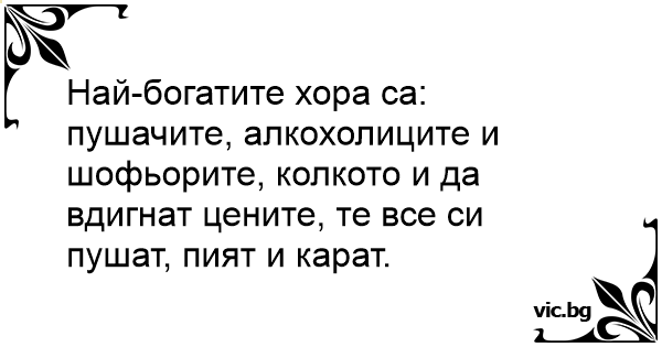 Най-богатите хора са: пушачите, алкохолиците и шофьорите, колкото и да вдигнат цените, те все си пушат, пият и карат.
