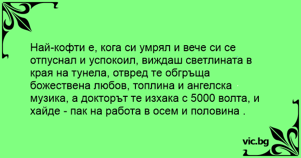 Най-кофти е, кога си умрял и вече си се отпуснал и успокоил, виждаш светлината в края на тунела, отвред те обгръща божествена любов, топлина и ангелска музика, а докторът те изхака с 5000 волта, и хайде - пак на работа в осем и половина .