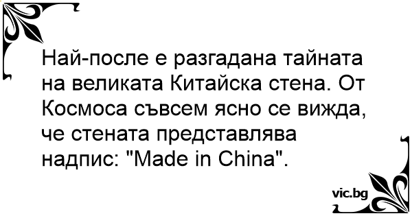 Най-после е разгадана тайната на великата Китайска стена. От Космоса съвсем ясно се вижда, че стената представлява надпис: "Made in China".