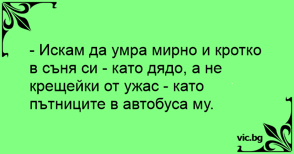 - Искам да умра мирно и кротко в съня си - като дядо, а не крещейки от ужас - като пътниците в автобуса му.