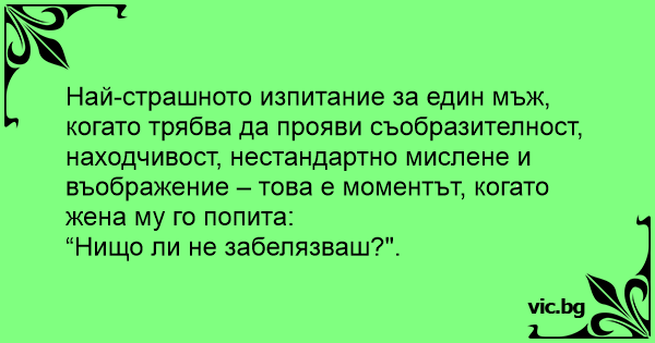 Най-страшното изпитание за един мъж, когато трябва да прояви съобразителност, находчивост, нестандартно мислене и въображение – това е моментът, когато жена му го попита:
