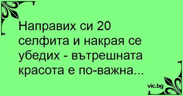 Направих си 20 селфита и накрая се убедих - вътрешната красота е по-важна... English Deutsch Español Русский Français Italiano Ελληνικά Македонски Türkçe Українська Português Polski Svenska Nederlands Dansk Norsk Suomi Magyar Româna Čeština Lietuvių Latviešu Hrvatski
