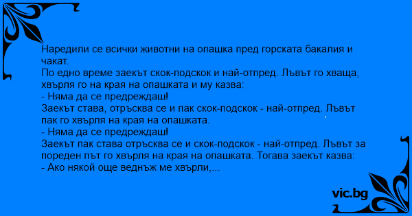 In padure se Deschisese un nou magazin. Se aseaza toate animalele in Fata usii astaptand sa se deschida Magazinul. Vine iepurele si se baga in fata. Ursul, suparat, ii zice: - Daca te mai bagi In...