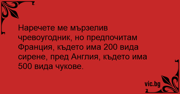 Наречете ме мързелив чревоугодник, но предпочитам Франция, където има 200 вида сирене, пред Англия, където има 500 вида чукове.