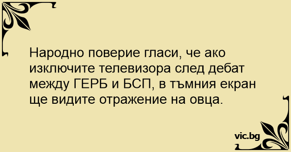 Народно поверие гласи, че ако изключите телевизора след дебат между ГЕРБ и БСП, в тъмния екран ще видите отражение на овца.