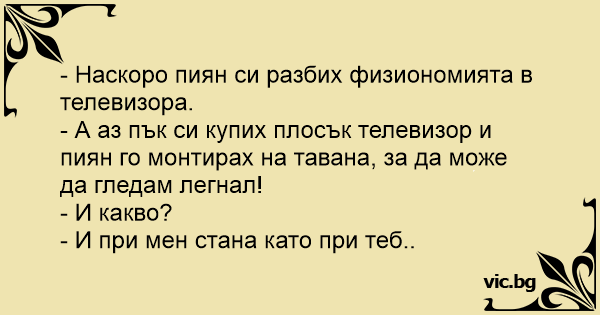 - А аз пък си купих плосък телевизор и пиян го монтирах на тавана, за да може да гледам легнал!