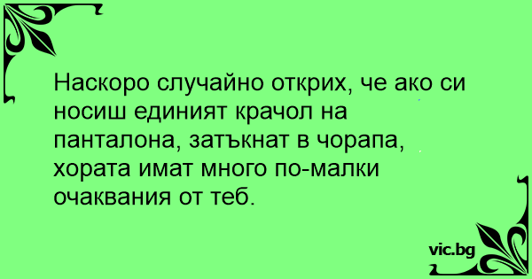 Наскоро случайно открих, че ако си носиш единият крачол на панталона, затъкнат в чорапа, хората имат много по-малки очаквания от теб.