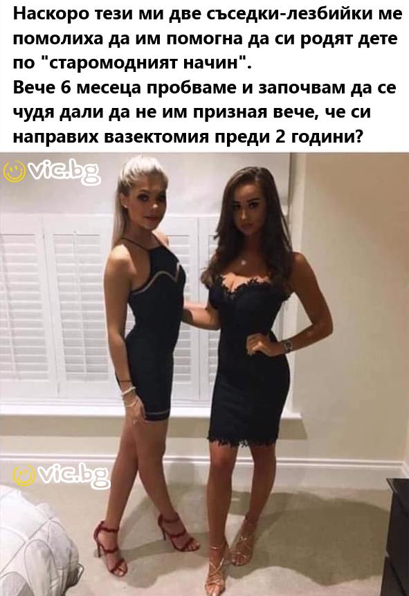 Наскоро тези ми две съседки-лезбийки ме помолиха да им помогна да си родят дете по "старомодният начин". Вече 6 месеца пробваме и започвам да се чудя дали да не им призная вече, че си направих...