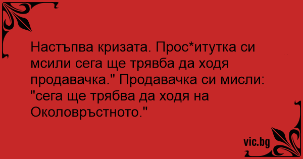 Настъпва кризата. Пpoctиtуtka си мсили сега ще трявба да ходя продавачка." Продавачка си мисли: "сега ще трябва да ходя на Околовръстното."