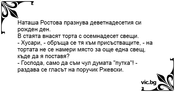 - Хусари, - обръща се тя към присъстващите, - на тортата не се намери място за още една свещ, къде да я поставя?
