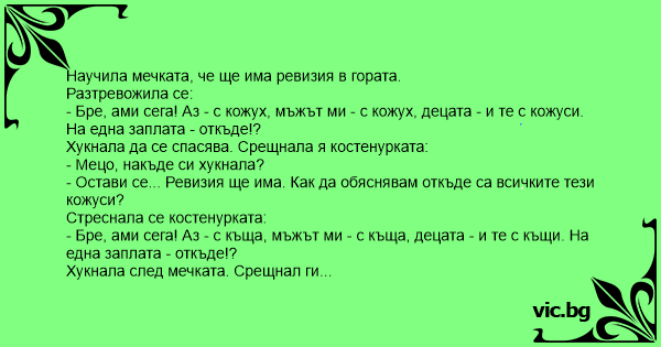 - Бре, ами сега! Аз - с кожух, мъжът ми - с кожух, децата - и те с кожуси. На една заплата - откъде!?