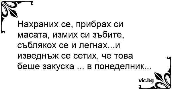 Нахраних се, прибрах си масата, измих си зъбите, съблякох се и легнах...и изведнъж се сетих, че това беше закуска ... в понеделник...