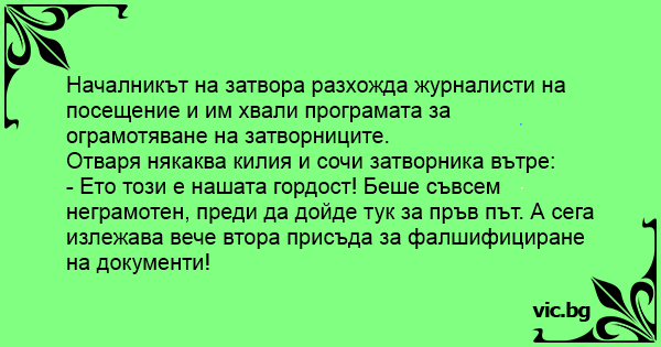 - Ето този е нашата гордост! Беше съвсем неграмотен, преди да дойде тук за пръв път. А сега излежава вече втора присъда за фалшифициране на документи!