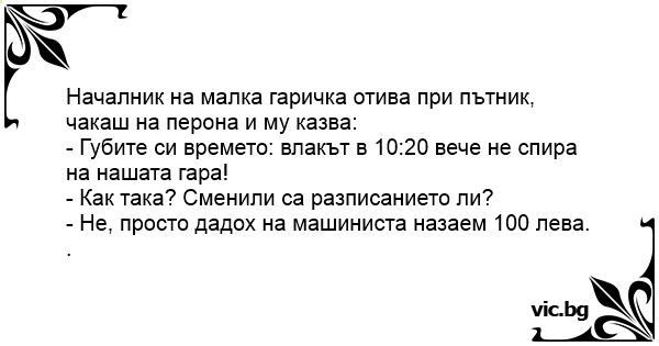 Началник на малка гаричка отива при пътник, чакаш на перона и му казва: