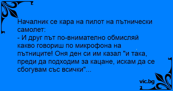 - И друг път по-внимателно обмисляй какво говориш по микрофона на пътниците! Оня ден си им казал "и така, преди да подходим за кацане, искам да се сбогувам със всички"...