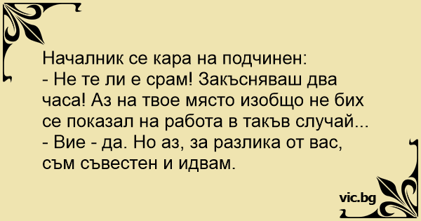 - Не те ли е срам! Закъсняваш два часа! Аз на твое място изобщо не бих се показал на работа в такъв случай...